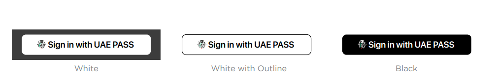 Depending on the platform, the system provides up to three options for the appearance of the UAE&#x20;PASS buttons: white, white with an outline, and black. Choose the appearance that works best with&#x20;the background on which the button displays.